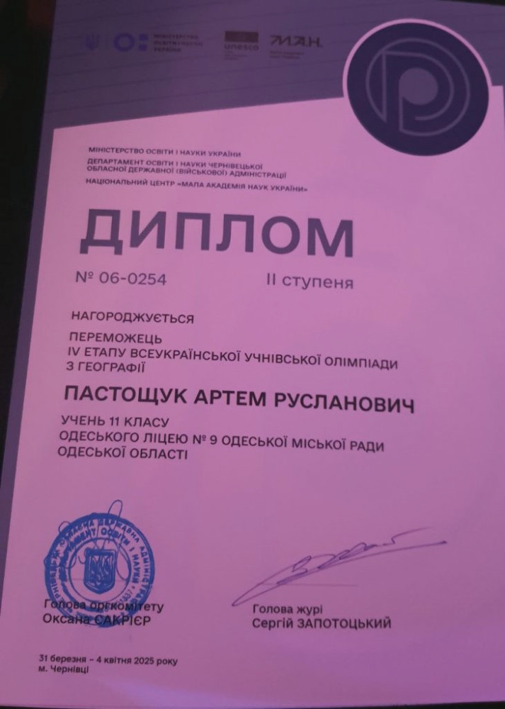 - Пастощук Артем, ученик 11 класса Одесского лицея № 9 (учитель Ястремская Светлана).