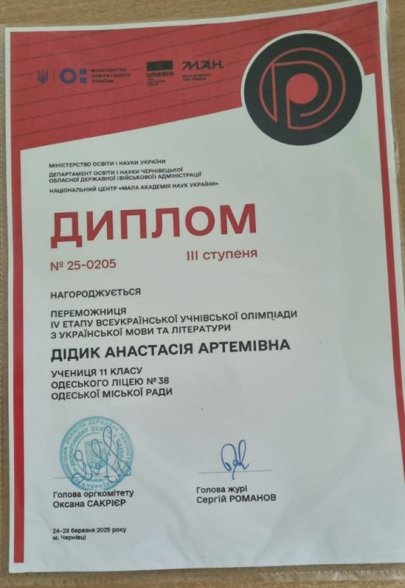Анастасия продемонстрировала не только глубокие знания по предметам, но и креативное мышление, аналитические способности, творческий подход и искреннюю любовь к родному украинскому слову.