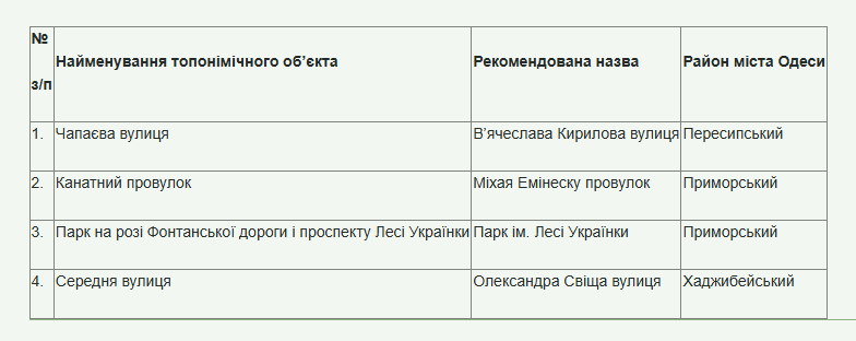 Согласно Уставу территориальной громады города Одессы, с учетом рекомендаций Историко-топонимической комиссии при Исполнительном комитете Одесского городского совета (заседания от 13 февраля и 17 апреля 2025 года), проводятся консультации с общественностью в формате электронного обсуждения по вопросам переименования/наименования объектов топонимики города Одессы.